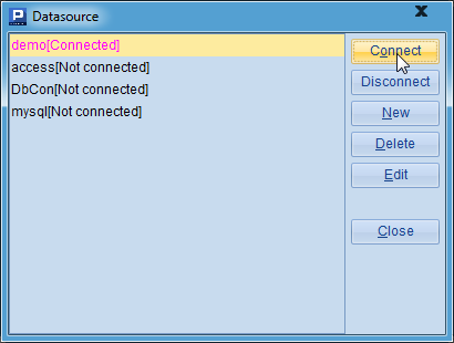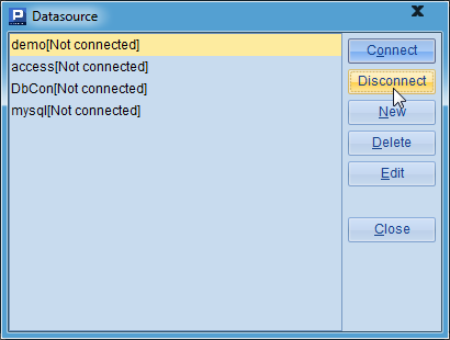 同样,数据库连接的断开,也有两种方式,除了上面调用db.close()函数之外,还可以在数据源管理器中关闭选定数据源: