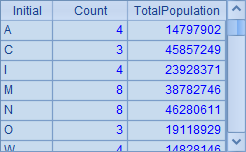 =A3.new(left(ABBR,1):Initial, ~.count():Count, ~.sum(POPULATION):TotalPopulation) |