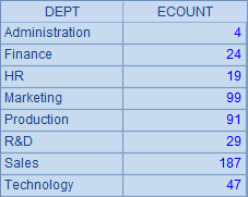 =demo.query("select DEPT, count(*) as ECOUNT from EMPLOYEE group by DEPT order by DEPT") |