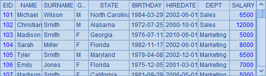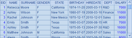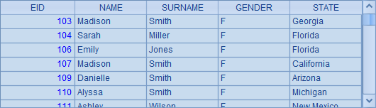 =demo.cursor("select EID, NAME, SURNAME, GENDER, STATE from EMPLOYEE where GENDER=? and EID>?","F",100) |