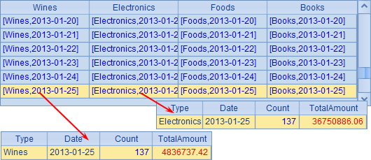 A5~A8中,分别对每一类产品分类聚合运算,各自返回缓存文件游标。关于groupx的使用,在7.5外存分组原理中有更详细的说明。在A9中将各类产品每日的销售数据按照日期对齐连接。在A10中取出前25天的统计结果如下: