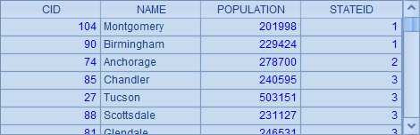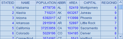 $(demo) select STATEID, NAME, ABBR from STATES order by ABBR |