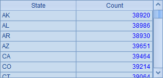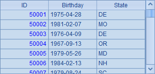 首先,我们先来准备一个简单的大数据表记录员工资料,包括员工编号、所在州和生日三个字段,其中编号顺次生成,所在州使用缩写,从demo数据库的STATES表中随机获取,生日从1994-1-1往前,随机选择10,000天之内的日期。为方便起见,大数据表存储为集文件。