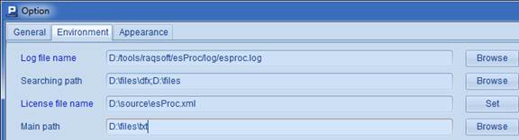 在集算器中,import函数用来将文件中的数据读入为序表。其中,A1中创建文件对象,当文件名中未指定路径时,将到设置中的主路径中寻找。在菜单栏中选择Tool>Options,即可在Option窗口的Environment页面中,查看或设置主路径:
