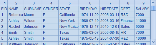 在将文本文件中的数据读入时,数据的数据类型会按照第一行数据自动解析。由于empolyee.txt的第一行数据是字段名,因此A3中各个字段的数据都会解析为字符串。如上面结果中的_1列与_9列,都是字符串,因此在展现时都是靠左对齐的;在A2结果中的EID字段和SALARY字段中的数据则是整数,展现时靠右对齐。