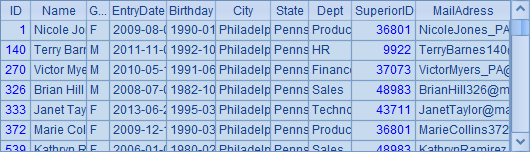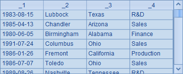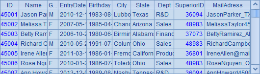 通过跨网游标,将较复杂的多行记录处理在子网格中完成,使得程序目的明确,简洁易读。同时,用游标来操作,可以很方便地完成大数据文件的分析计算。例子中的数据量并不很大,在A3中,一次读出所有费城的员工数据如下: