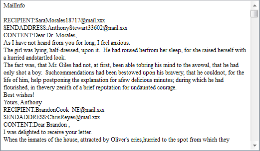 有时,存储在文本中的数据,不仅需要将多行数据合并为一条记录,同时结构也更为复杂。如下面的D:\files\mailInfo.txt: