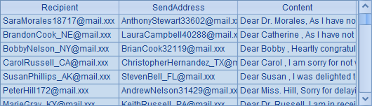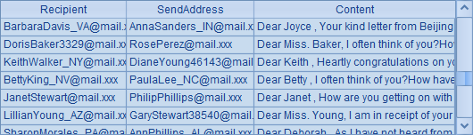 文档中,简单存储了一些邮件的内容,包括收件人地址,发件人地址及邮件正文,分别用RECIPIENT:,SENDADDRESS:和CONTENT:作为开头。其中,邮件正文的行数是不定的,因此这样的数据无法读出指定行数的数据合并处理,更无法直接使用。在集算器中,同样可以使用跨网游标,先在readMail.dfx中处理数据:
