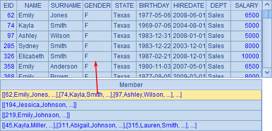 在A2执行多线程计算时,使用了3个参数,计算时将会按顺序匹配,即使用的参数依次为[Sales,F,Texas], [R&D,F,Illinois], [Finance,F,Ohio] 和 [Production,F,Florida]。此时寻找最大年龄的员工时,指定了部门、性别和所在州。A2中的计算结果如下: