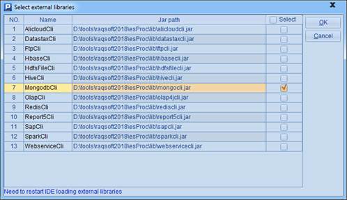在集算器安装后,在集算器安装目录的esProc\lib路径下,附带了一些支持外部库的jar包,包括:阿里云(alicloudcli.jar)、HBASE数据库(hbasecli.jar)、HDFS数据库(hdfsfilecli.jar)、Hive数据库(hivecli.jar)、DataStax数据库/Cassandra(datastaxcli.jar)、FTP服务(ftpcli.jar)、MongoDB(mongocli.jar)、多维数据库(olap4jcli.jar)、redis数据库(rediscli.jar)、润乾report5(report5cli.jar)、SAP(sapcli.jar)、Apache Spark(sparkcli.jar)、Web Service服务(webservicecli.jar)。