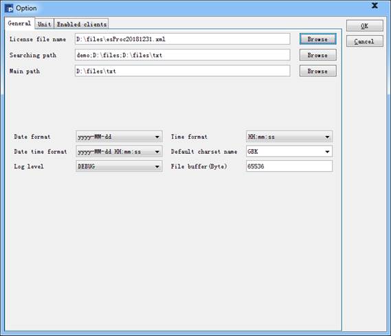 在General页面中,可以配置授权文件、主路径、寻址路径、日期时间格式、默认字符编码、日志等级、文件缓存区字节数等信息。其中,日志级别Log level可为OFF, SEVERE, WARNING, INFO, DEBUG等,优先级依次降低,若为OFF则不输出任何日志信息;若为INFO,则只输出SEVERE,WARNING,INFO等各级别的信息,依次类推。