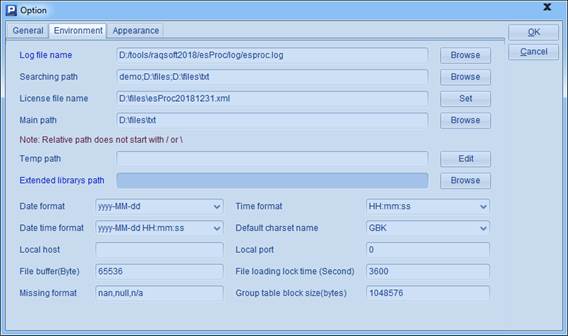 这里的配置信息,实际上和集算器IDE中的对应配置是同步的,这些信息,也可以在菜单栏中点击Tool>Options,在选项设定的Environment页面中查看或修改: