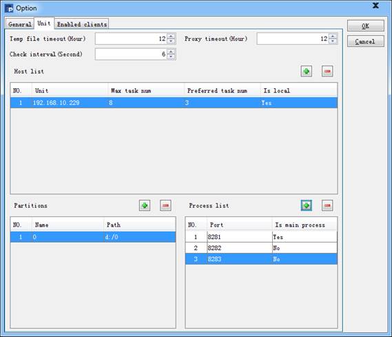 分机列表Host list中,可以配置本机上所有可能用来运行服务器的分机,配置它们的IP地址,在进程列表Process list中,可以为一个IP地址配置多个进程的端口Port,其中第一个为主进程。服务器启动时,会自动在分机列表中,寻找未被占用的IP和端口。需要注意的是,IP地址需要是本机的真实IP,在使用多网卡的情况下可以设定多个IP。