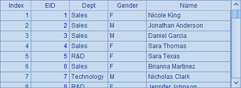 =to(100000).new(#:EID,A6(B6.pseg(rand())):Dept,if(rand()<0.5,"F","M"):Gender,if(Gender=="M",A3(rand(B3)+1), A4(rand(B4)+1))/" "/A5(rand(B5)+1):Name) |