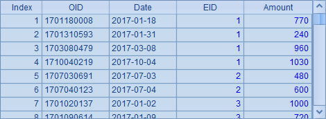 B9中简单生成了2017年的工作日序列,作为测试数据中的订单日期。A10中在每个工作日中随机生成订单数据,并按照EID和OID排序,结果如下: