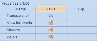 可以看到,Transparency的修改使绘制的点变淡透明,Shadow设定后可在图形右下产生淡淡的阴影效果。此外,如果将可视设为false,图元将隐藏不绘制;Allow text overlapping和集算器图形之轴图元中提到过的轴标签的允许重叠属性类似,如果选择为false,那么在绘制一组图元时,如果其中某个图元和已绘制的图元有重叠部分,那么将跳过不绘制。