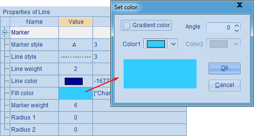 设定线为深蓝色虚线,线粗为2像素;Marker style为三角形,Marker weight设定为6个像素,并将Fill color改为浅蓝色。修改设定后,绘图如下: