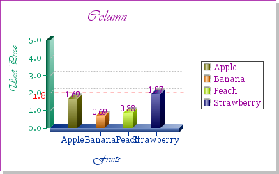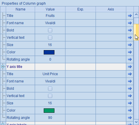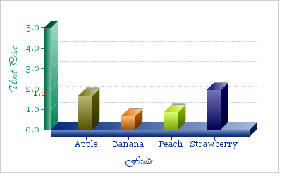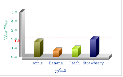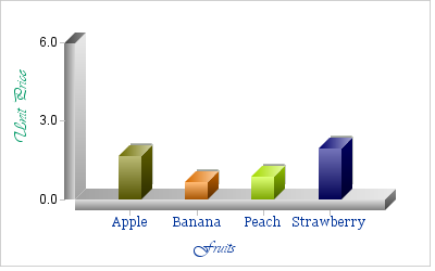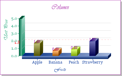 先来看一下横轴和纵轴的标题文字设定,现在修改A3中的代码为=A1.plot("GraphColumn", "categories": A2.(NAME),"values":A2.(UNITPRICE),"xTitle":"Fruits","xTitleFont":"Vivaldi", "xTitleSize":16,"xTitleColor":-16764007,"yTitle":"Unit Price","yTitleFont":"Vivaldi","yTitleSize":16, "yTitleColor":-16737946,"yTitleAngle":90),即修改柱形图的绘图参数如下: