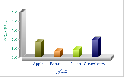 此时,A3中的代码为:=A1.plot("GraphColumn","categories":A2.(NAME), "values": A2.(UNITPRICE),"xTitle":"Fruits","xTitleFont":"Vivaldi","xTitleSize":16,"xTitleColor":-16764007,"yTitle":"Unit Price","yTitleFont":"Vivaldi","yTitleSize":16,"yTitleColor":-16737946,"yTitleAngle":90, "xLabelFont":"Georgia","xLabelColor":-16764007,"yLabelFont":"Georgia","yLabelColor":-16737946, "yEndValue":5,"yMinMarks":5),A4中的绘图结果如下: