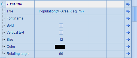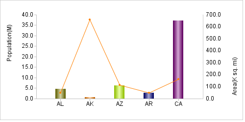 =A1.plot("Graph2Axis","categories":A5.(ABBR+","+Type),"values": A5.(Value),"drawShade":false,"lineThick":2,"yTitle":"Population(M);Area(K sq. mi)","yTitleAngle":90,"axisRightColor":-3355444) |
