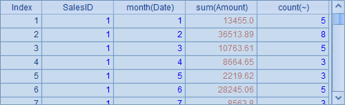 =A1.groups(SalesID, month(Date); sum(Amount), count(~)) |