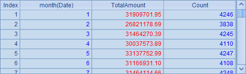 =A1.groups(month(Date); sum(decimal(string(Amount))):TotalAmount, count(~):Count) |