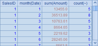 =A1.groups(SalesID, month(Date); sum(Amount), count(~)) |