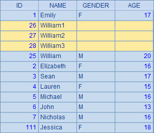 >A1.insert(2:3,25+#:ID,"William"+string(#):NAME) |