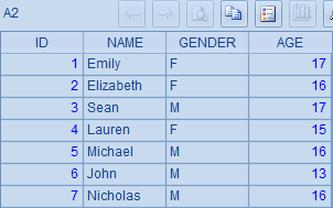 下面的网格中,在序表A1中追加1条记录r1,然后在第2行插入1条记录r2,其中r1依次设定字段值,r2指定字段名称设定字段值;最后再在第2行起插入3条记录r3,r4和r5,这些记录ID和NAME字段有值,其他字段为空: