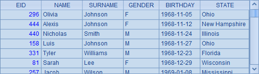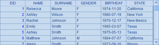 =demo.query("select EID,NAME,SURNAME,GENDER, BIRTHDAY,STATE from EMPLOYEE") |