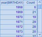 =A1.groups(year(BIRTHDAY);count(~):Count) |