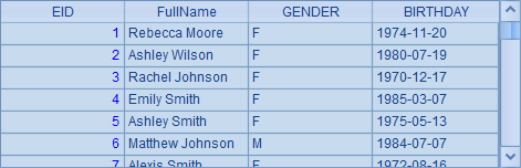 $(demo) select EID,NAME,SURNAME,BIRTHDAY,GENDER from EMPLOYEE |