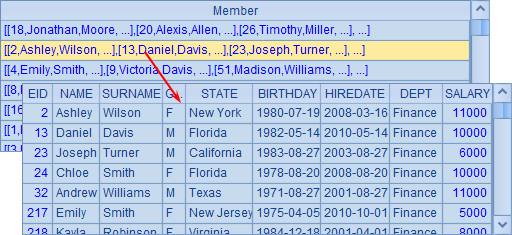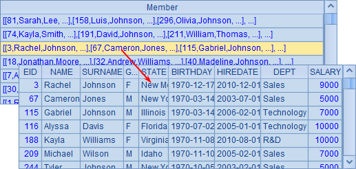再解说一下A3中的表达式:=A2.new(DEPT,count(~):Count,~.sum(SALARY):TotalSalary),由于A2是序表A1的分组结果,其每个成员都是一个记录的集合,即排列,因此new函数对A2进行循环时,其内部表达式都是对排列进行操作的。比如DEPT表示取当前成员的第一条记录的部门字段的值;~.sum(SALARY)表示对当前排列的SALARY字段求和。