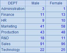 =A2.new(DEPT,~.count(GENDER=="M"):Male, ~.count(GENDER=="F"):Female) |