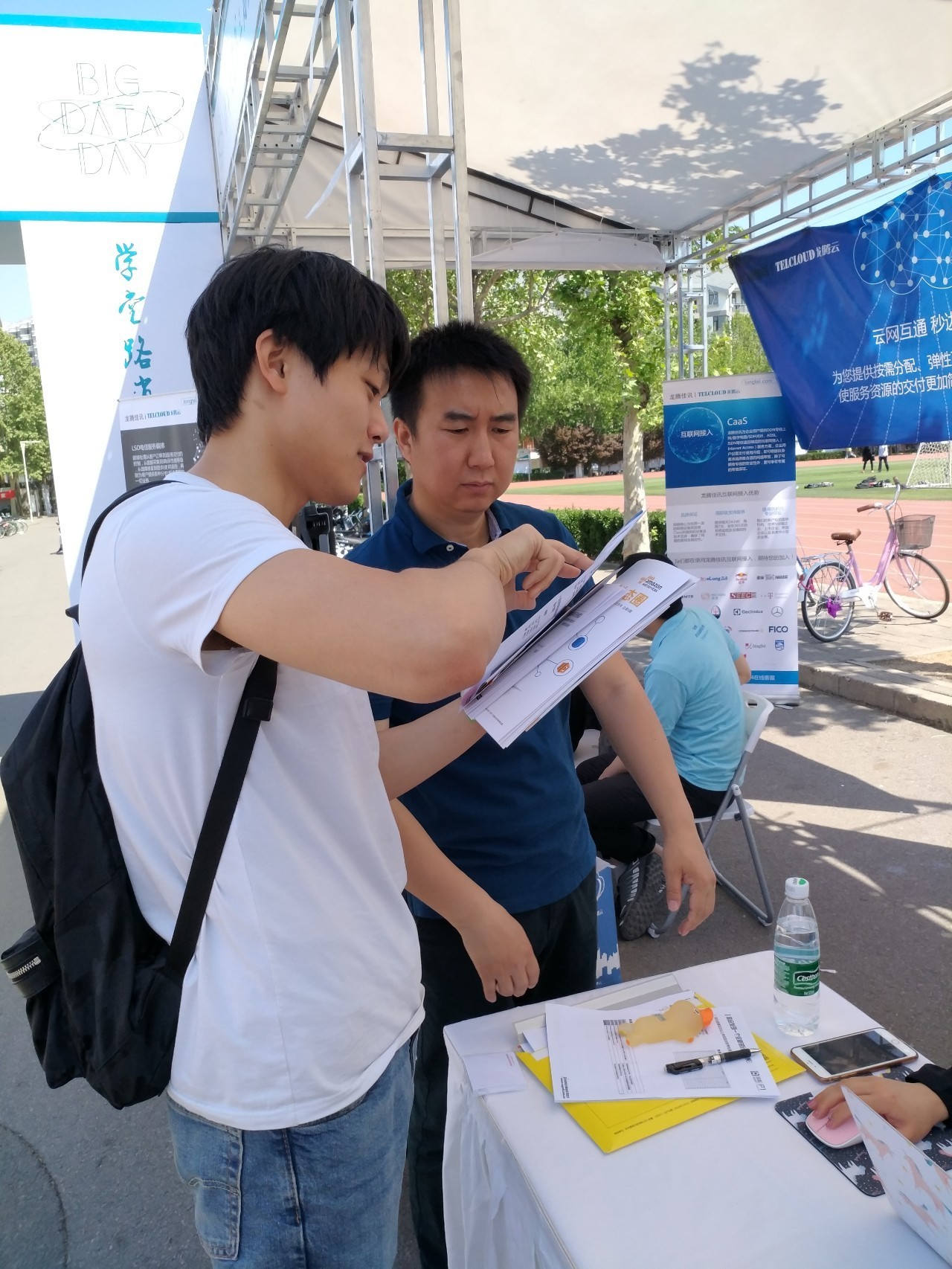 活动现场,润乾软件的产品优势和技术实力吸引来很多同学的关注和交流,润乾高级工程师 陈国强 为同学们亲切讲解了润乾集算器等核心产品的技术优势和功能特点,并为同学们就大数据领域的技术问题答疑解惑。