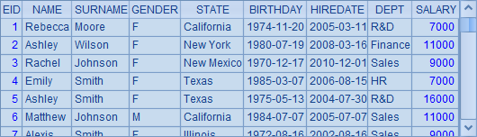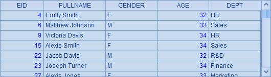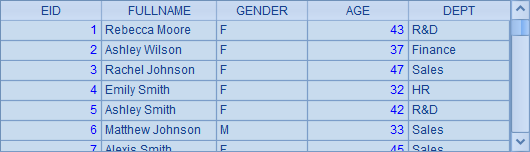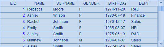 =demo.query("select EID, NAME, SURNAME, GENDER, BIRTHDAY, DEPT from EMPLOYEE") |