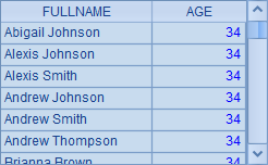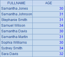 根据名(NAME)和姓(SURNAME)计算出全名(FULLNAME),同时根据生日(BIRTHDAY)计算出年龄(AGE),A2与A3中的查询结果基本是相同的,如下: