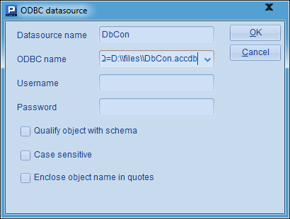 下面我们先来研究数据库的错误信息。在这里,用一个Access文件DbCon.accdb作为目标数据库,在集算器中,新建一个ODBC数据源,直接使用这个文件中的数据,连接串填入:DRIVER=Microsoft Access Driver (*.mdb, *.accdb);DBQ=D:\\files\\DbCon.accdb: