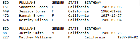 执行后,分别读出California州且30岁以下的女员工与男员工,输出结果如下: