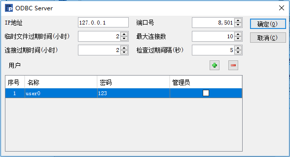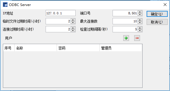 在上方可以配置ODBC服务的端口、临时文件超时时间、最大连接数、连接超时时间、检测间隔等。在中间部分可以执行ODBC服务的用户管理,设置允许访问的用户名和密码。例如配置如下: