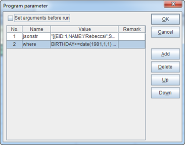 需要查询1981年1月1日(含)之后出生的女员工,esProc程序可以从外部获得两个输入参数“jsonstr”和“where”条件,如下图: