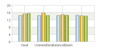 由于这个图中除了用分类表示不同的项目,还需用系列表示不同的运动员,因此枚举轴上的逻辑坐标需要包含分类和系列的信息,将分类和系列的值用逗号分隔开,如"Vault,Becky Downie"。与点图元类似,当数据坐标有多个时,会绘制多个柱子。