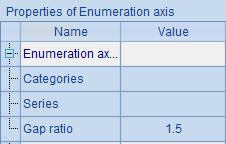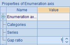 柱形图中,柱子会有一个基本宽度,绘制时不会超过这个基本宽度。这个基本宽度,是由柱子的总数以及枚举轴的Gap ratio属性决定的。Gap ratio表示不同分类的柱子之间的空白区域宽度,与一个柱子基本宽度的比率,默认情况下这个数值为1.5,表示间隙宽度为柱子基本宽度的1.5倍: