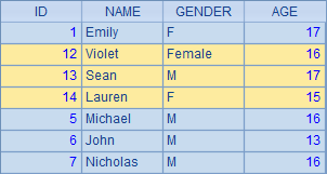 下面的网格中,先将第2条记录的GENDER字段修改为Female,NAME字段修改为Violet;再讲第2条起的连续3条记录的ID加10: