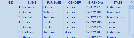 =demo.query("select EID,NAME,SURNAME,GENDER, BIRTHDAY,STATE from EMPLOYEE") |