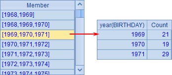 =A1.groups(year(BIRTHDAY);count(~):Count) |