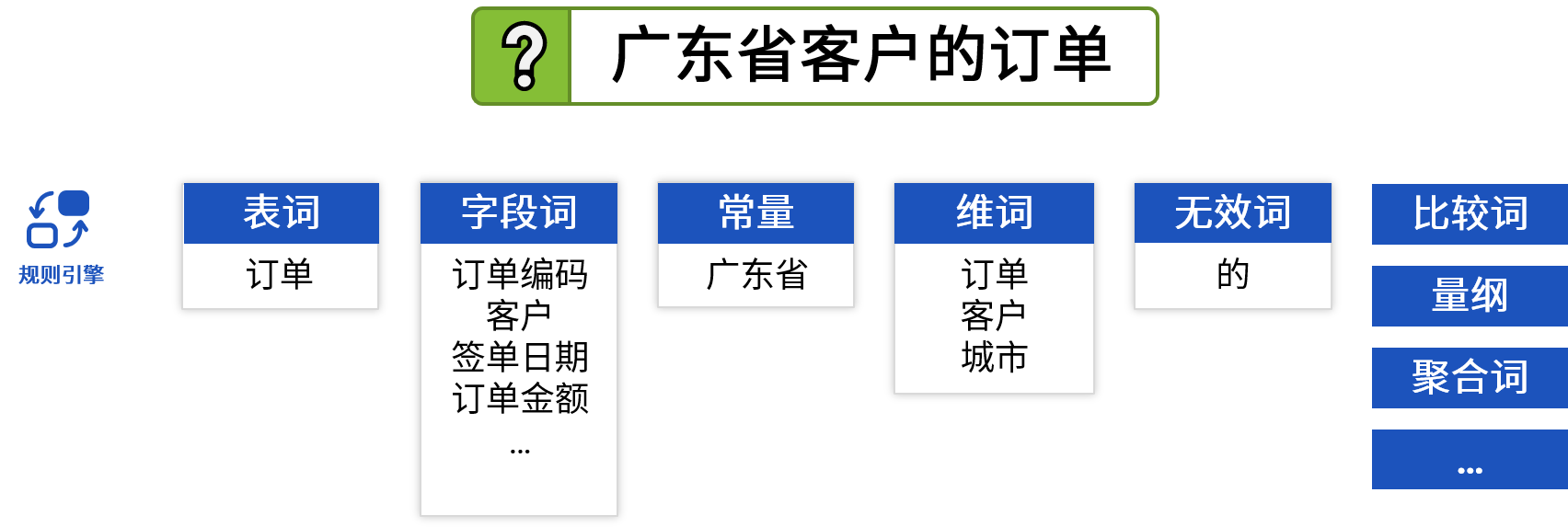 • 示例:“请帮我查一下”、“有哪些”、“那个”。 • 应用:用户输入“请帮我查一下有哪些销售额高的商品”,引擎会忽略加粗部分,直接解析核心意图 |