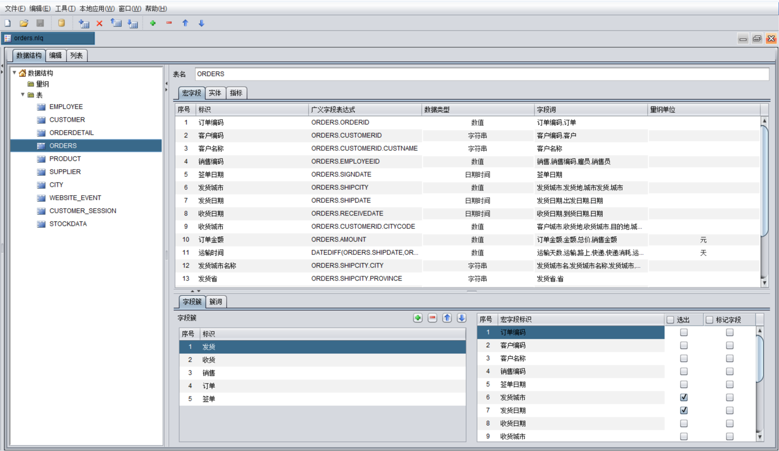 • 示例:物理表销售订单可以定义两个实体: - “全部订单”:包含所有字段 - “本年新订单”:仅包含Year(签单日期)=Year(Now())的订单,并只显示订单ID、金额等核心字段 |