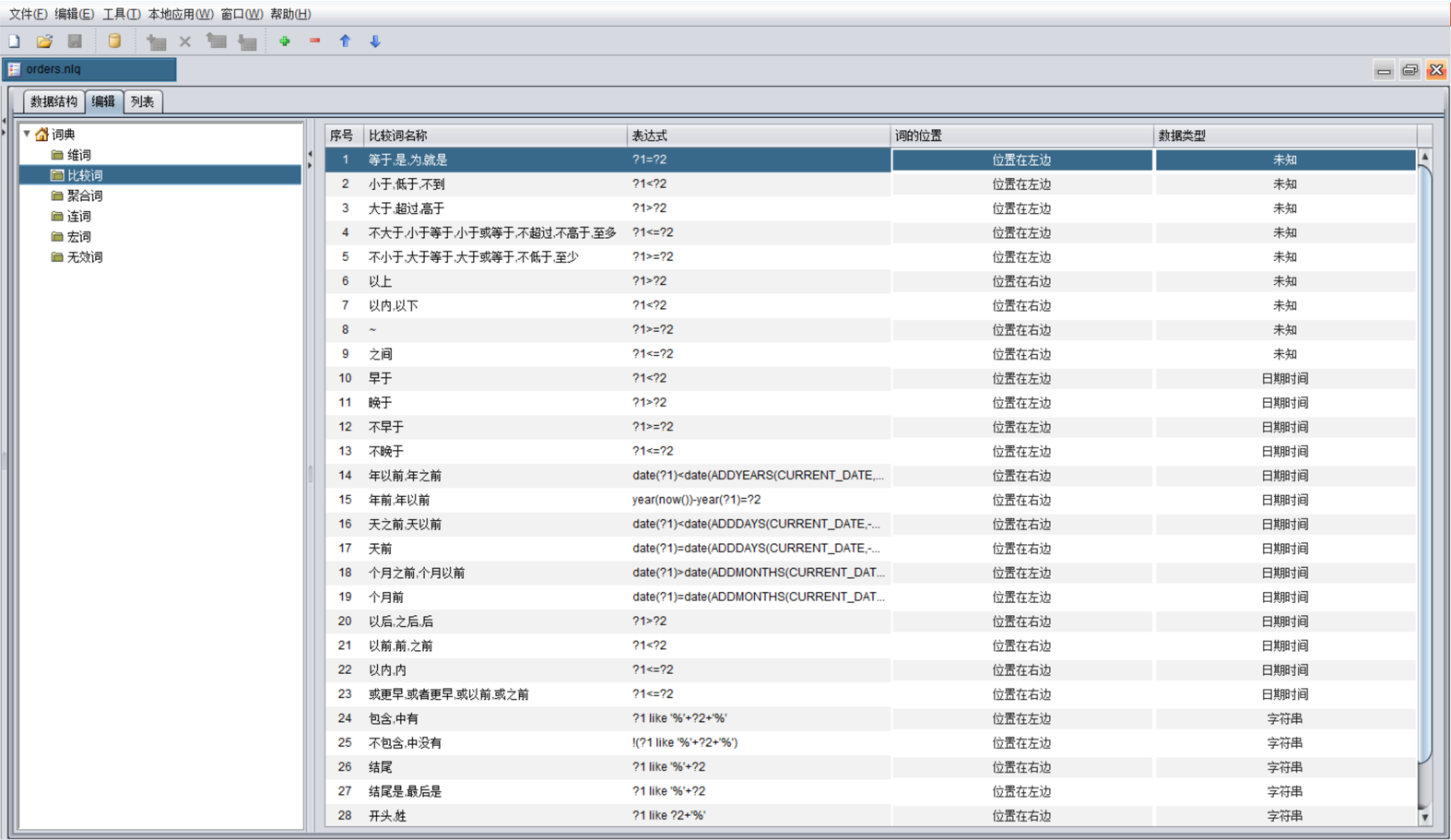 | 比较词与连词 | 定义过滤关系与条件间的逻辑连接 |