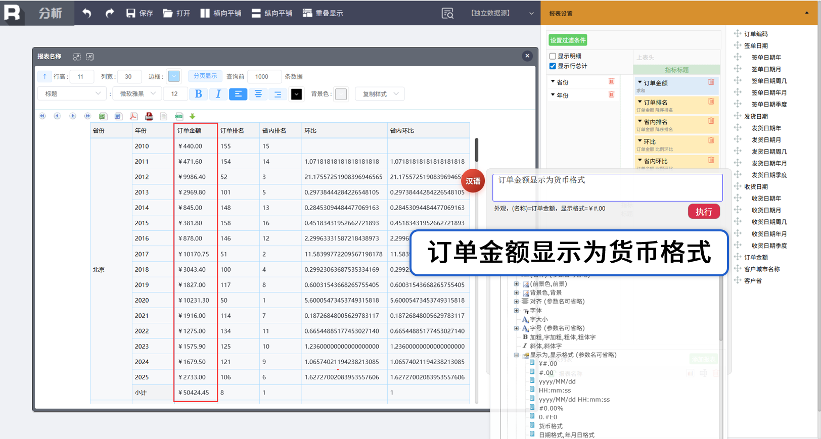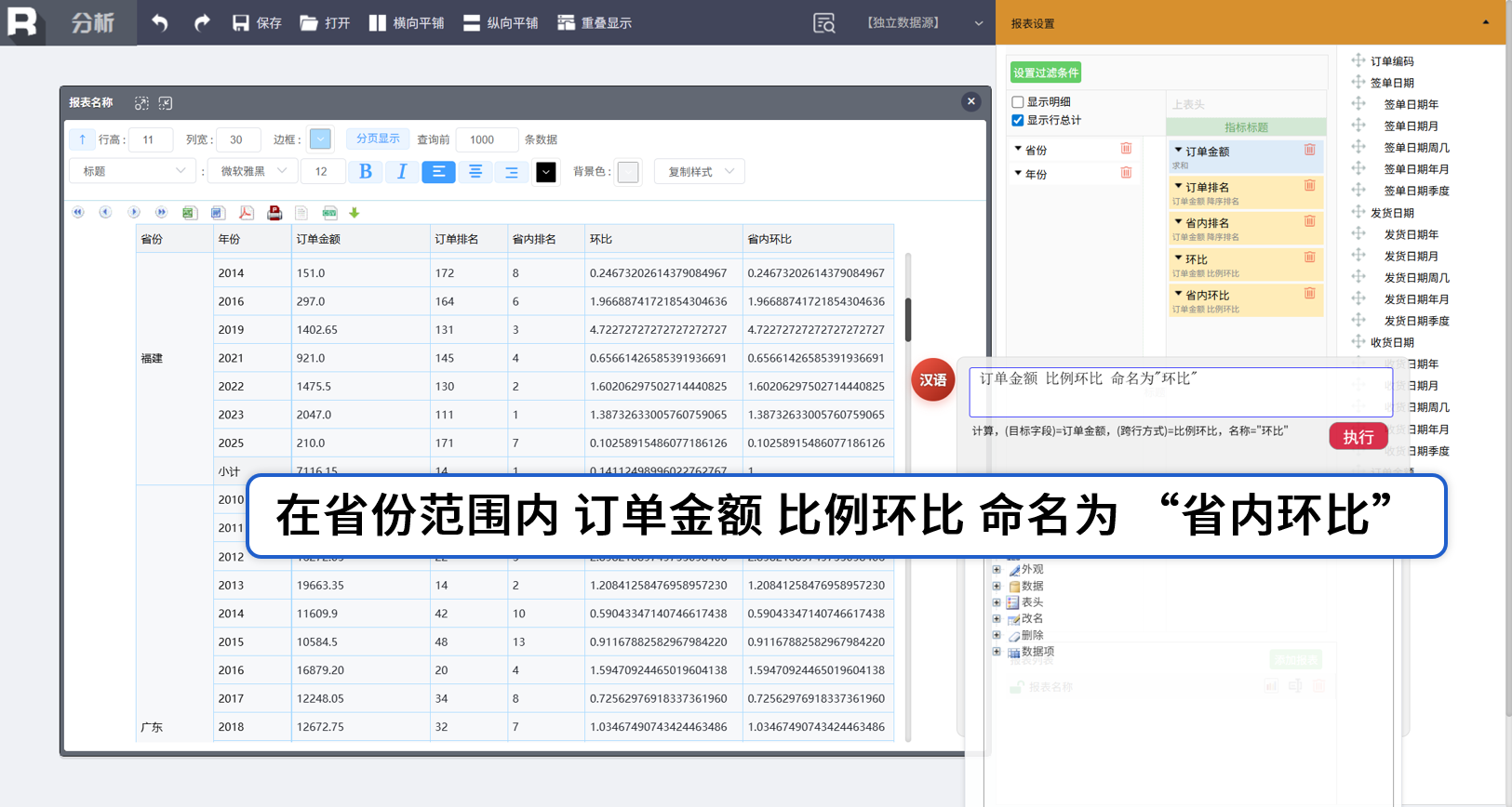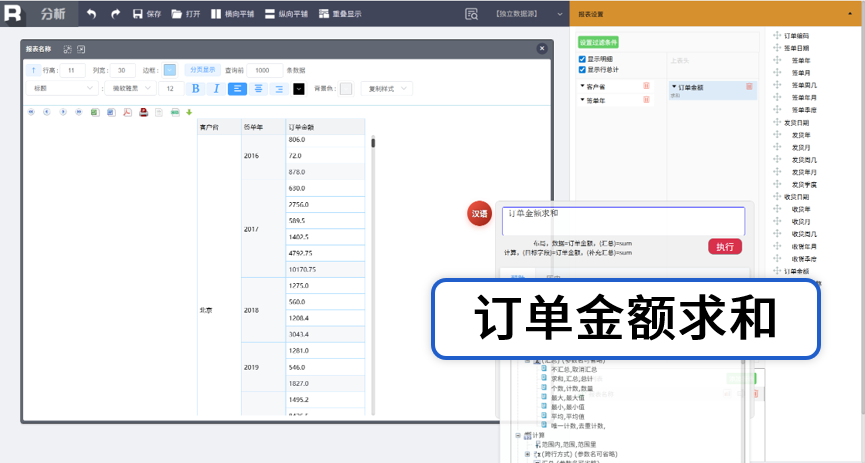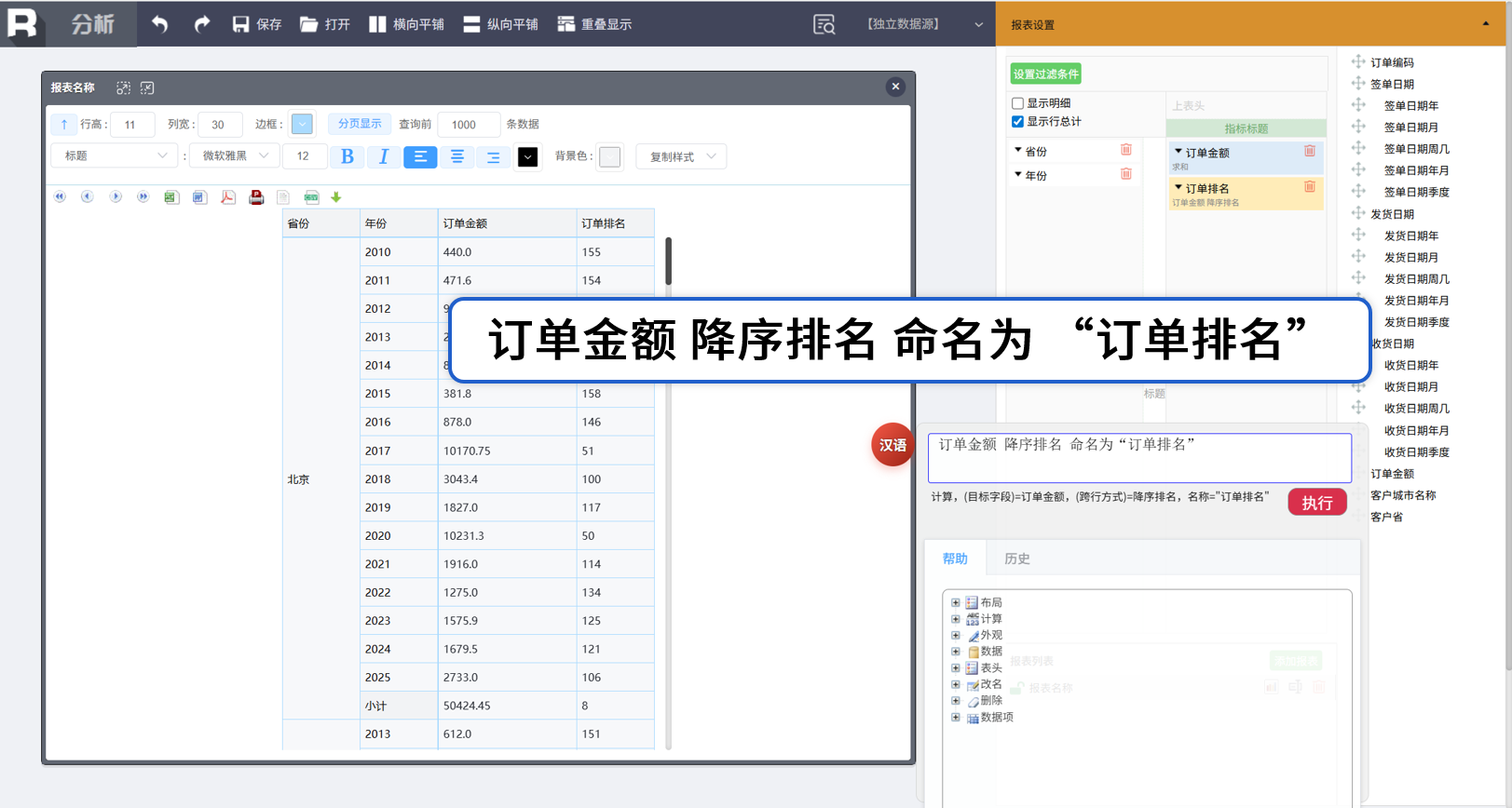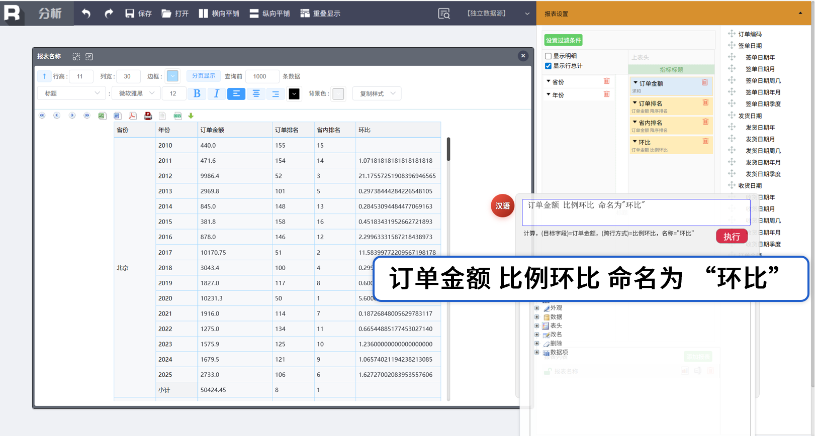 • 基础字段:直接映射到表字段,如“订单金额” • 计算字段:通过表达式定义,如BMI指数 = (体重(kg) / 身高(m)²) • 外键字段:通过关联引入其他表信息,如通过“客户ID”引入“客户名称” |